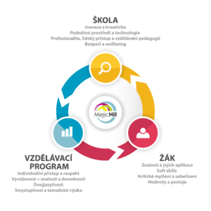 Vycházíme z principů dovedností 21. století, tzv. soft skills, ty zařazujeme do výuky už v mateřské škole. Děti se učí spolupracovat, komunikovat, společně řešit problémy. V základní škole vycházíme z definice 6 C soft skills – communication, cooperation, critical thinking, creativity, citizenship a character. Z těchto dovedností jsme vytvořili systém pro rozvoj soft skills našich žáků, kterým postupně procházejí od 1. do 9. třídy. Soft skills zařazujeme cíleně do výukových hodin i celkově do života školy. Sledujeme úroveň žáků při jejich osvojování, schopnosti aplikace i aktivního každodenního využívání.
