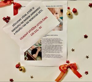 Na adventním dobročinném jarmarku jsme vydělali 72 000 Kč pro tři děti nemocné cystickou fibrózou, které jsou navíc ve složité sociální situaci. Všichni žáci školy společně vyráběli dekorace a dárky, které jsme na jarmarku úspěšně prodávali. Poděkování z Klubu nemocných si přečtěte ZDE